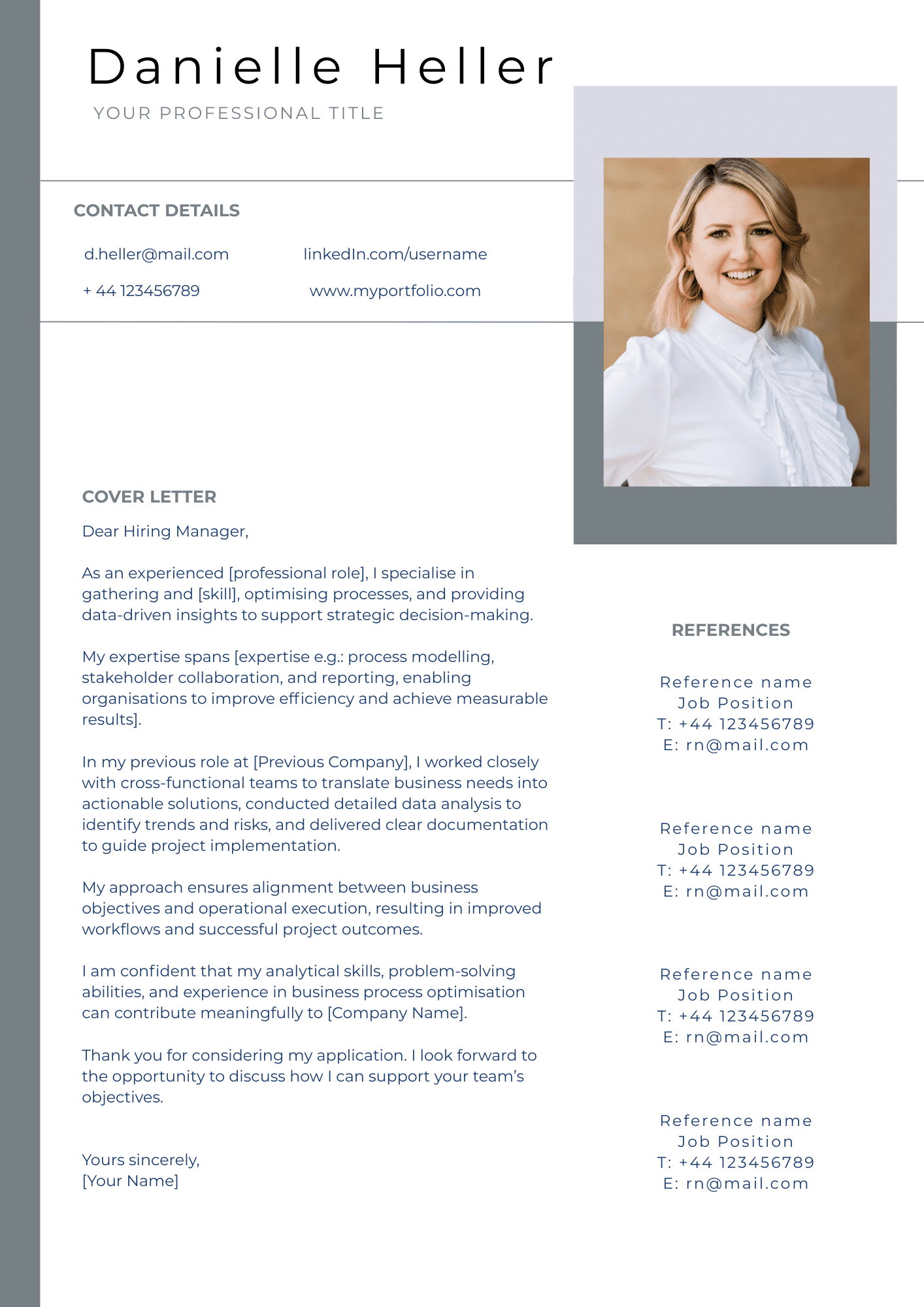 Stand out as a skilled analyst with a CV and cover letter tailored for data-driven roles. Open in Canva, add your details, and create professional, recruiter-ready documents.