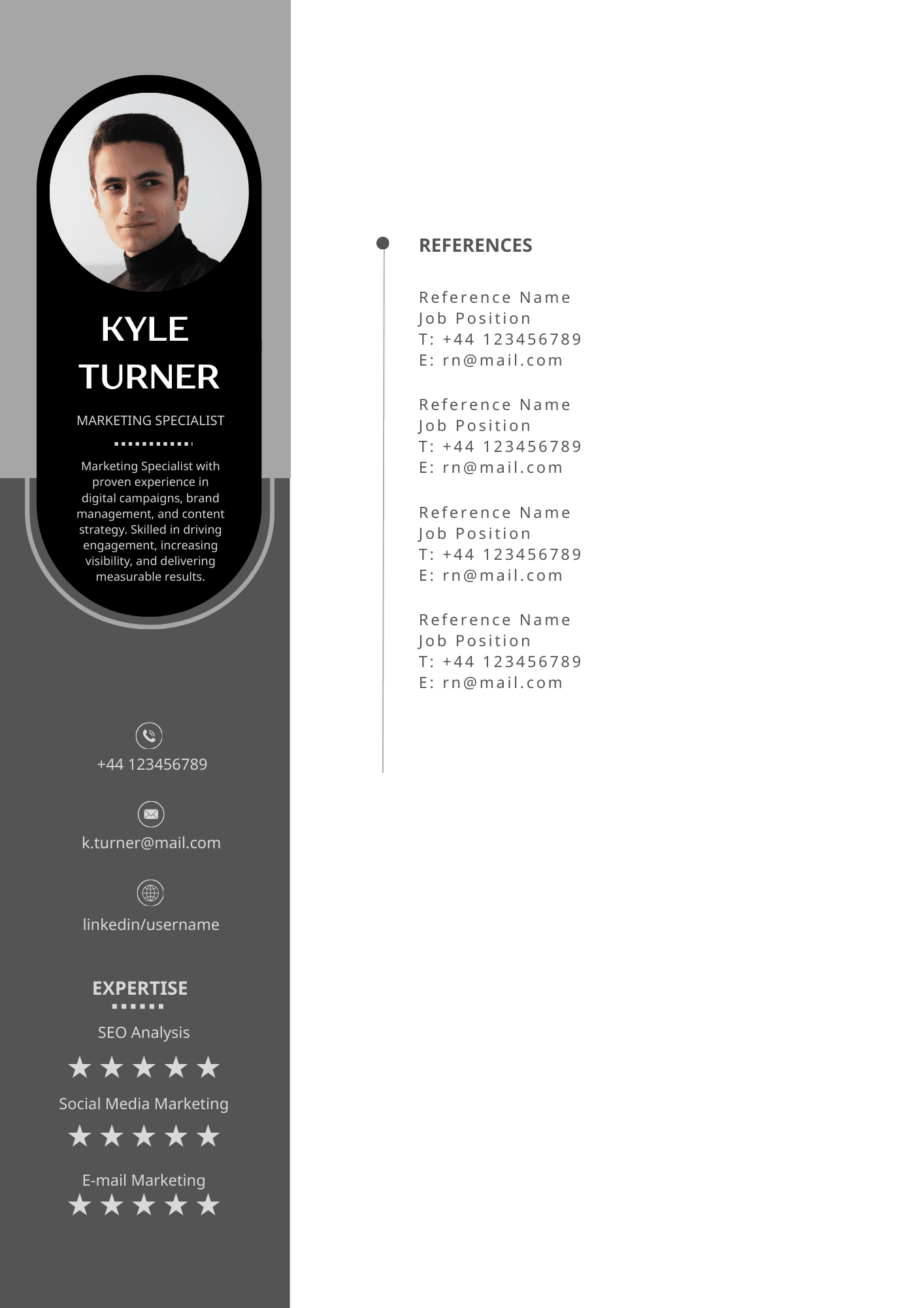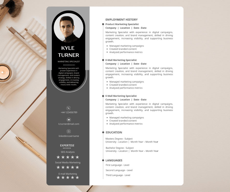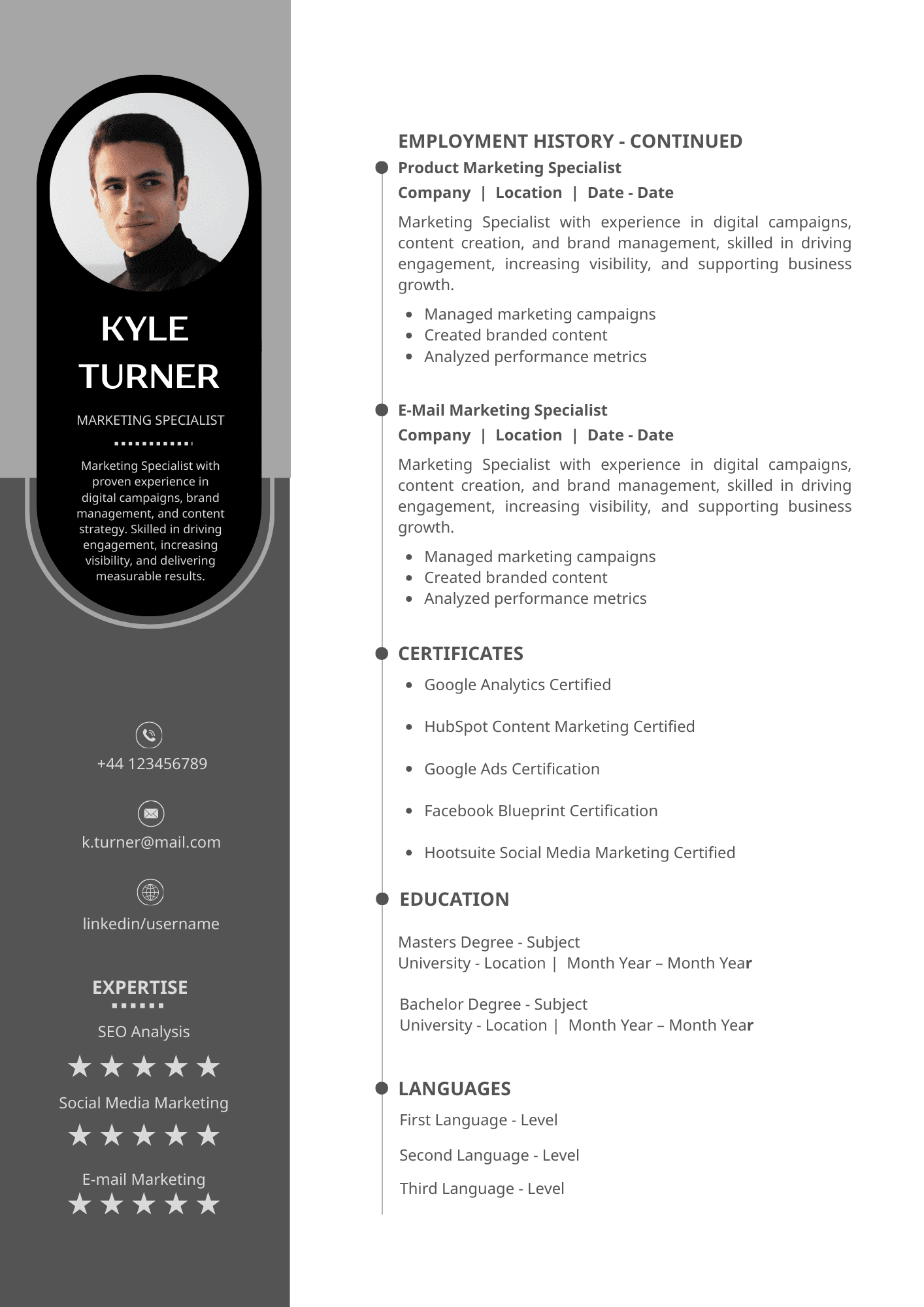 1-page Marketing Specialist CV – concise, visually striking, and professional