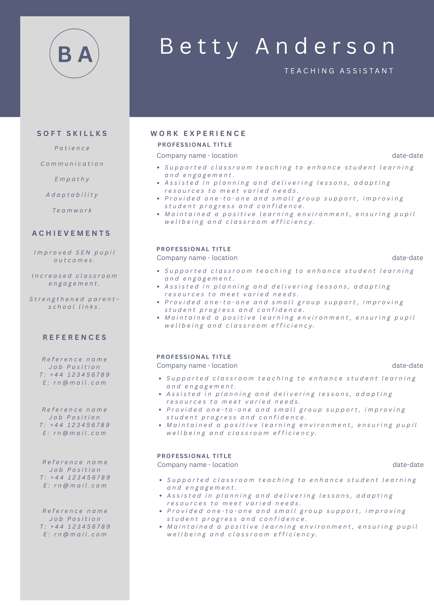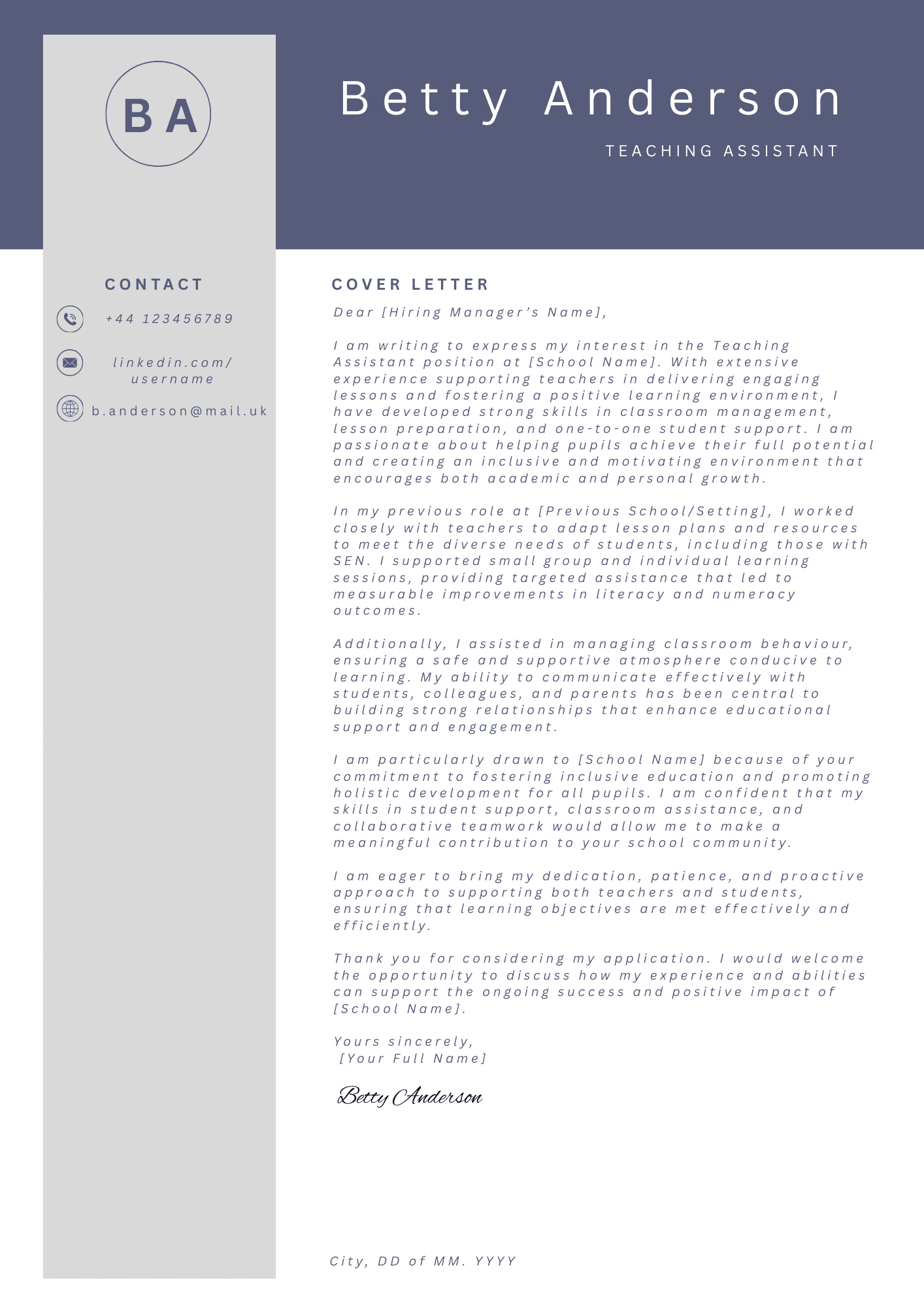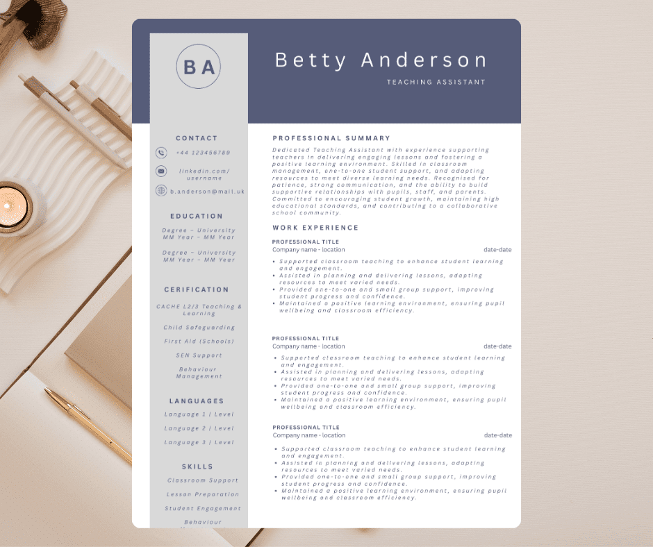 Demonstrate your classroom support expertise confidently. Open in Canva, add your information, and create a professional CV and cover letter that pass ATS scans and appeal to schools and educational institutions.